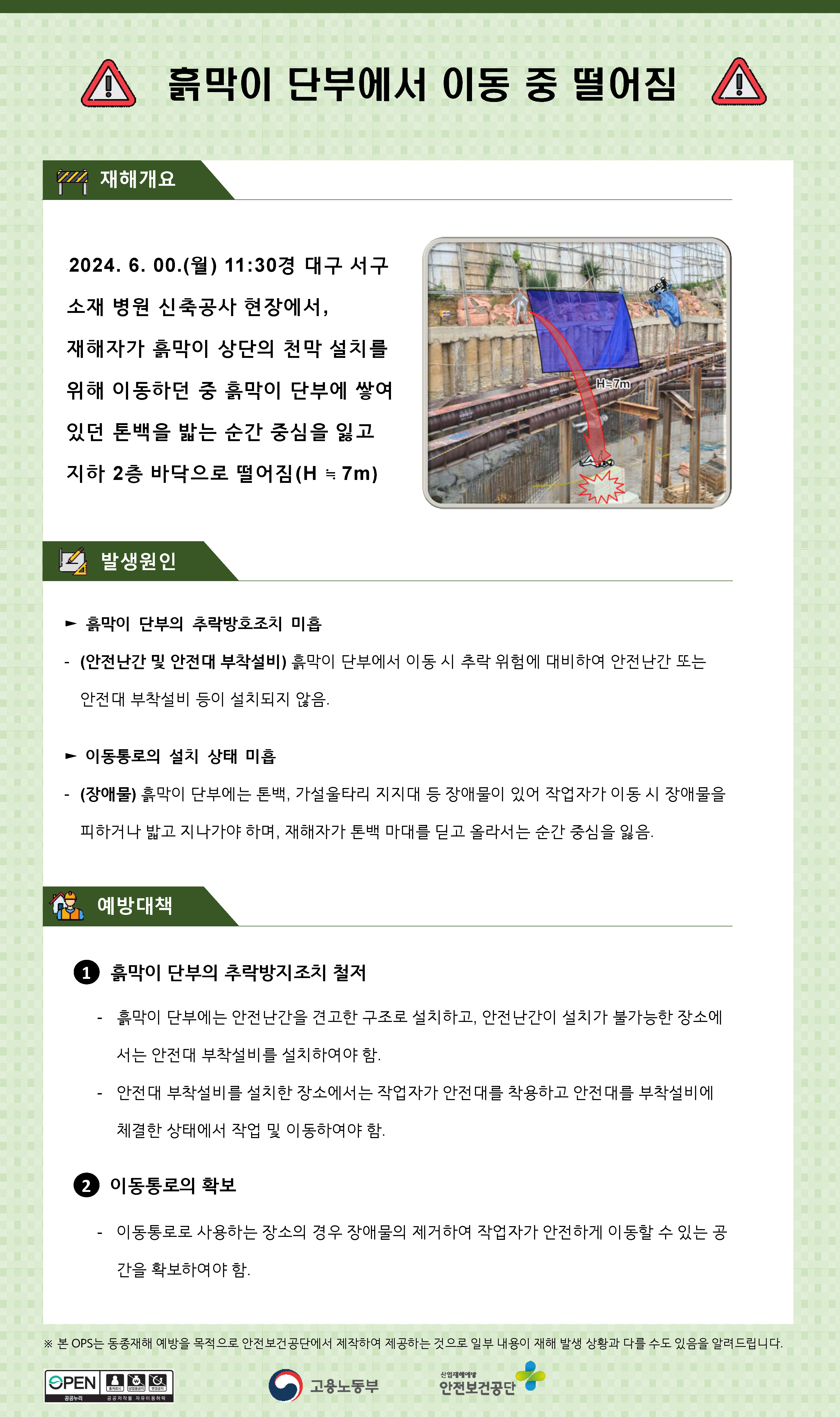 ‘2024. 6. 00.(월) 11:30경 대구 서구 소재 병원 신축공사 현장에서, 재해자가 흙막이 상단의 천막 설치를 위해 이동하던 중 흙막이 단부에 쌓여 있던 톤백을 밟는 순간 중심을 잃고 지하 2층 바닥으로 떨어짐(H ≒ 7m)
