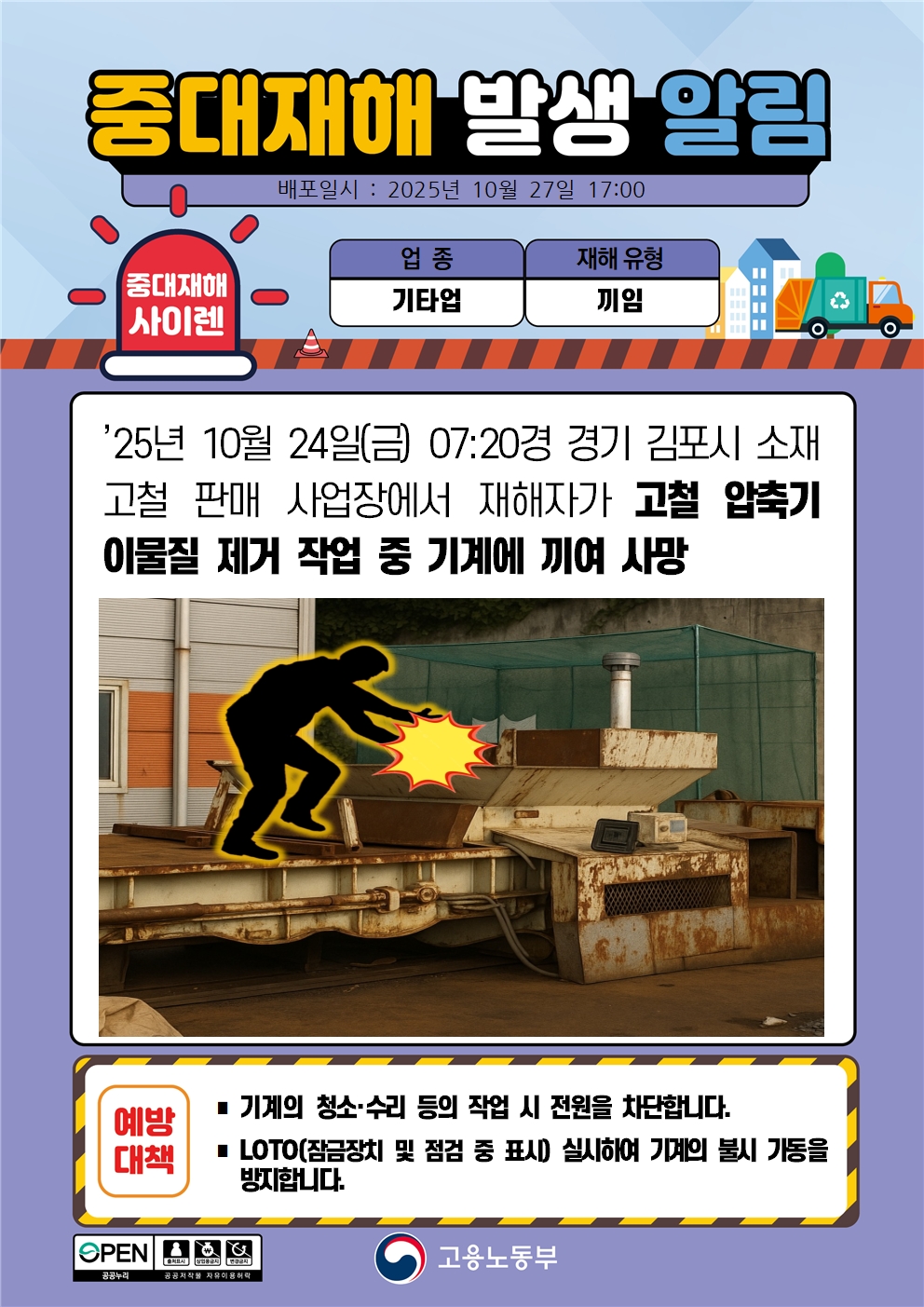 (251027)중대재해 발생 알림 - 고철 압축기 이물질 제거 작업 중 기계에 끼어 사망 안전이 0 142 0 0 (251027)중대재해 발생 알림(1)경기 김포시 소재 고철 판매 사업장에서 재해자가 고철 압축기 이물질 제거 작업 중 기계에 끼어 사망 0 0