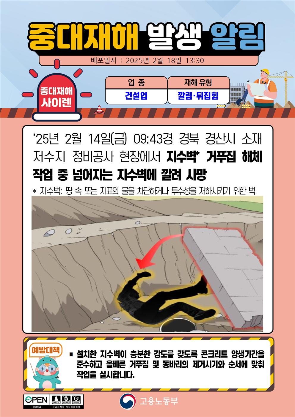 <2025년 2월 14일(금)> 경북 경산시 소재, 저수지 정비공사 현장에서 지수벽 거푸집 해체작업 중 넘어지는 지… 안전이 0 232 0 0 https://kosha.or.kr/constplan/ECSAA00110M01/notificationDetail.do + 41 <2025년 2월 14일(금)> 경북 경산시 소재, 저수지 정비공사 현장에서 지수벽 거푸집 해체작업 중 넘어지는 지수벽에 깔려 사망 <출처> 안전보건공단 0 0