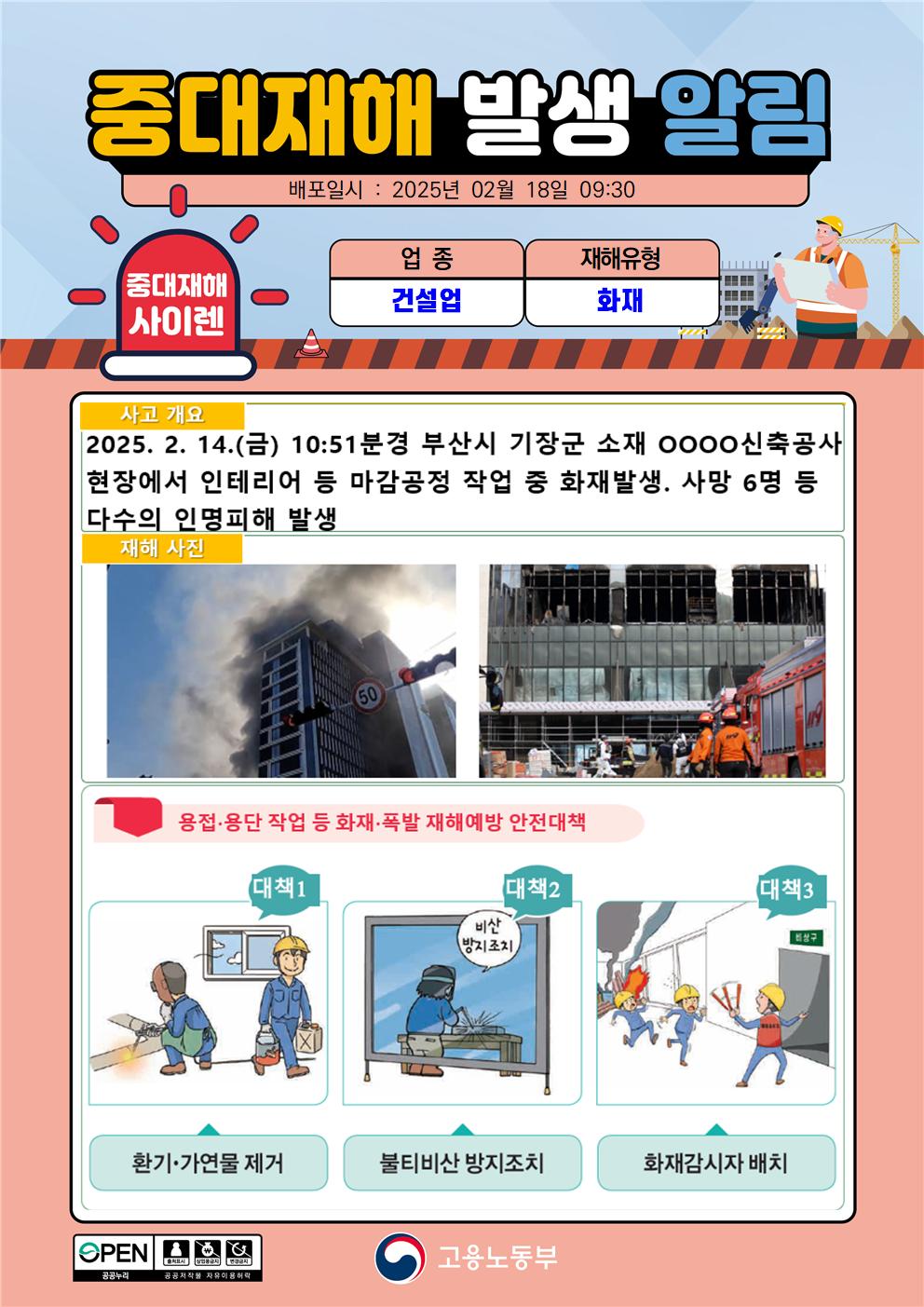 부산시 기장군 소재, 인테리어 등 마감공정 작업 중 화재 발생으로 6명 사망 등 다수의 인명피해 발생 안전이 0 314 0 0 https://kosha.or.kr/constplan/ECSAA00110M01/notificationDetail.do + 53 <2025년 2월14일(금)> 부산시 기장군 소재, 인테리어 등 마감공정 작업 중 화재 발생으로 6명 사망 등 다수의 인명피해 발생 <출처> 안전보건공단 0 0