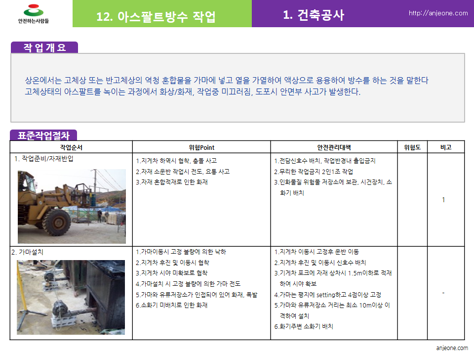 고체상태의 아스팔트를 녹이는 과정에서 화상/화재, 작업중 미끄러짐, 도포시 안면부 사고가 발생한다.