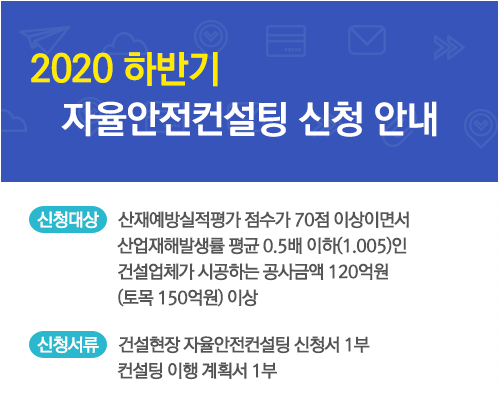 2020년 하반기 건설업 자율안전 관리 신청 안내 안전이 0 5264 0 0 http://www.moel.go.kr/local/ansan/news/notice/noticeView.do?bbs_seq=20… + 258 붙임1건설업 자율안전관리 안내문.hwp (95.0K) + 72 붙임2자율안전컨설팅 신청서 및 점검표.hwp (62.5K) + 71 붙임42020년 상반기 건설업 자율안전컨설팅 신청 안내 공문.pdf (220.2K) + 59 2020년 하반기 건설업 자율안전 관리 신청 안내 031-422-2918 0 0