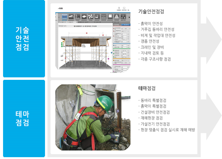 주기적 점검, 테마점검, 기술점검, 계절별특성점검 등 전문인력을 통한 각종 안전점검 실시로 현장내 잠재된